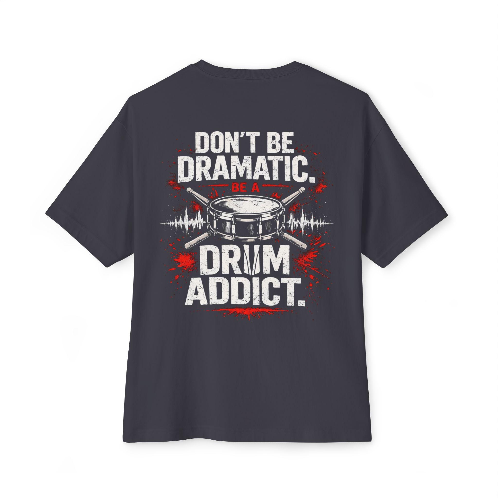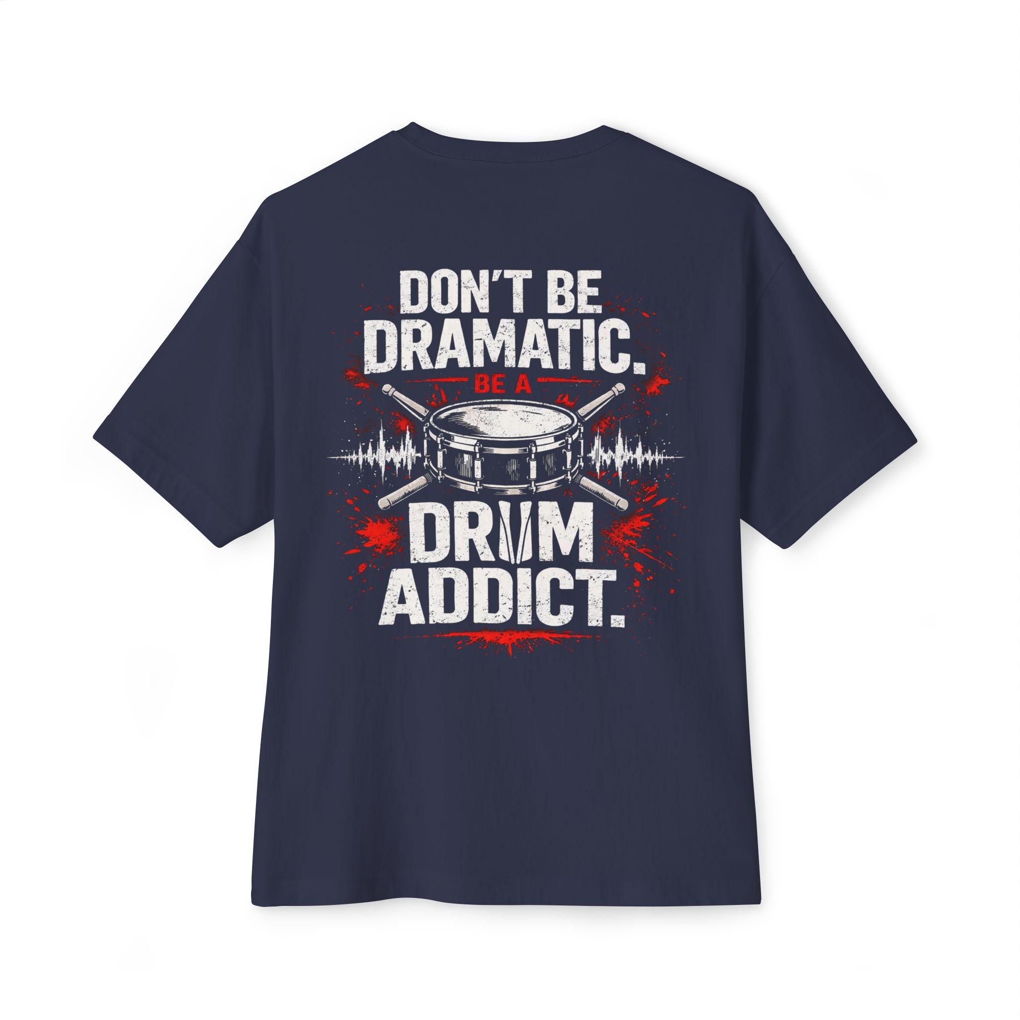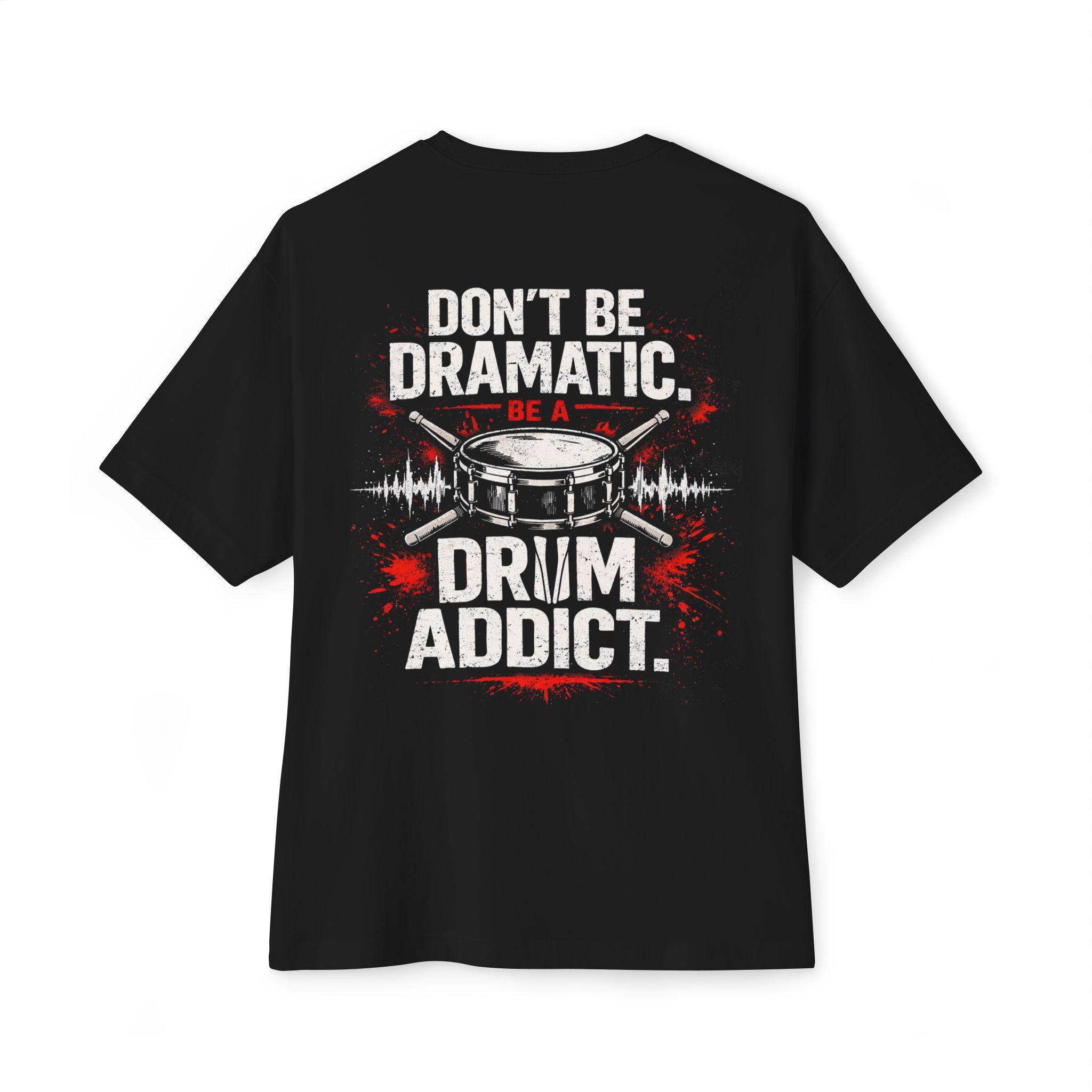 This oversized boxy tee channels the steady, relentless pulse of a practiced drummer. It hangs loose over the shoulders, giving room to breathe and move during long rehearsals or impromptu jam sessions. Wear it to practice, to the studio, or on nights when you need to feel grounded to the beat. The muted, no-nonsense message — “Don’t be dramatic. Be a drum addict.” — sits like an inside nod to anyone who lives for rhythm. Soft, substantial cotton and a relaxed silhouette make it comfortable for standing behind a kit, lugging a snare between venues, or lounging after a late set. It settles into the everyday of people who count in fours, talk tempo, and appreciate gear that quietly endures.